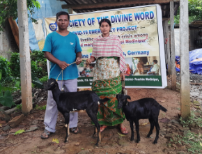 Haben wir gekauft und diese Zicklein 14 Selbsthilfegruppen zur Verfügung gestellt. 140 Frauen kümmern sich nun gemeinsam um die Aufzucht. Es sind schwarze bengalische Ziegen, die widerstandsfähig und für die Zucht gut geeignet sind.