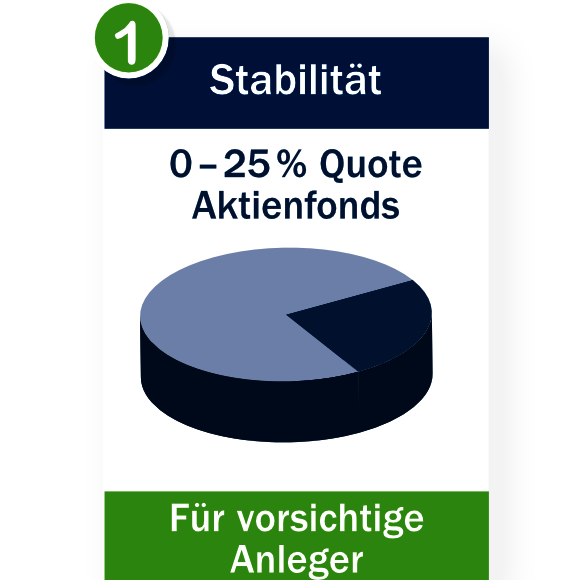 Das Depot Stabilität ist auf Substanzsicherung und kontinuierlichen Vermögenszuwachs ausgerichtet. Hinweis: Aufgrund der Marktentwicklung können auch bei dieser Anlagestrategie Substanzverluste nicht mit Sicherheit ausgeschlossen werden. Die Vermögenswerte werden zu maximal 25% in Aktienfonds aus dem In- oder Ausland investiert. Das übrige Vermögen wird in risikoarme Fonds angelegt. Die Anteile der Zielfonds lauten zu mindestens 65 % auf Euro, der Rest vor allem auf US-Dollar und andere Währungen der OECD-Länder.