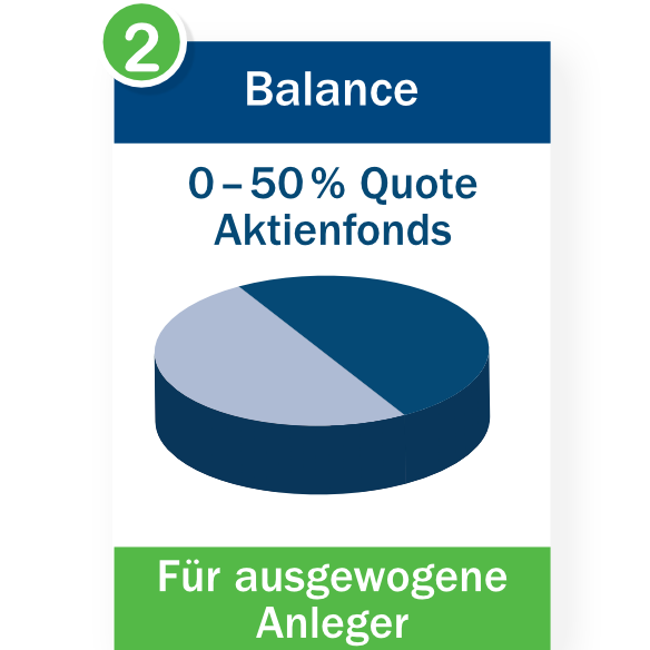 Das Depot Balance strebt auf mittlere bis längere Sicht die Erzielung möglichst hoher Renditen aus einem ausgewogenen, der jeweiligen Marktsituation angepassten Verhältnis der Anlagen an. Im Rahmen dieser Anlage werden durchschnittliche Risiken eingegangen, sodass Substanzverluste möglich sind. Die Vermögenswerte werden zu maximal 50% in Aktienfonds aus dem In- oder Ausland investiert. Das übrige Vermögen wird in risikoarme Fonds angelegt. Die Anteile der Zielfonds lauten zu mindestens 50% auf Euro, der Rest vor allem auf US-Dollar und andere Währungen der OECD-Länder.